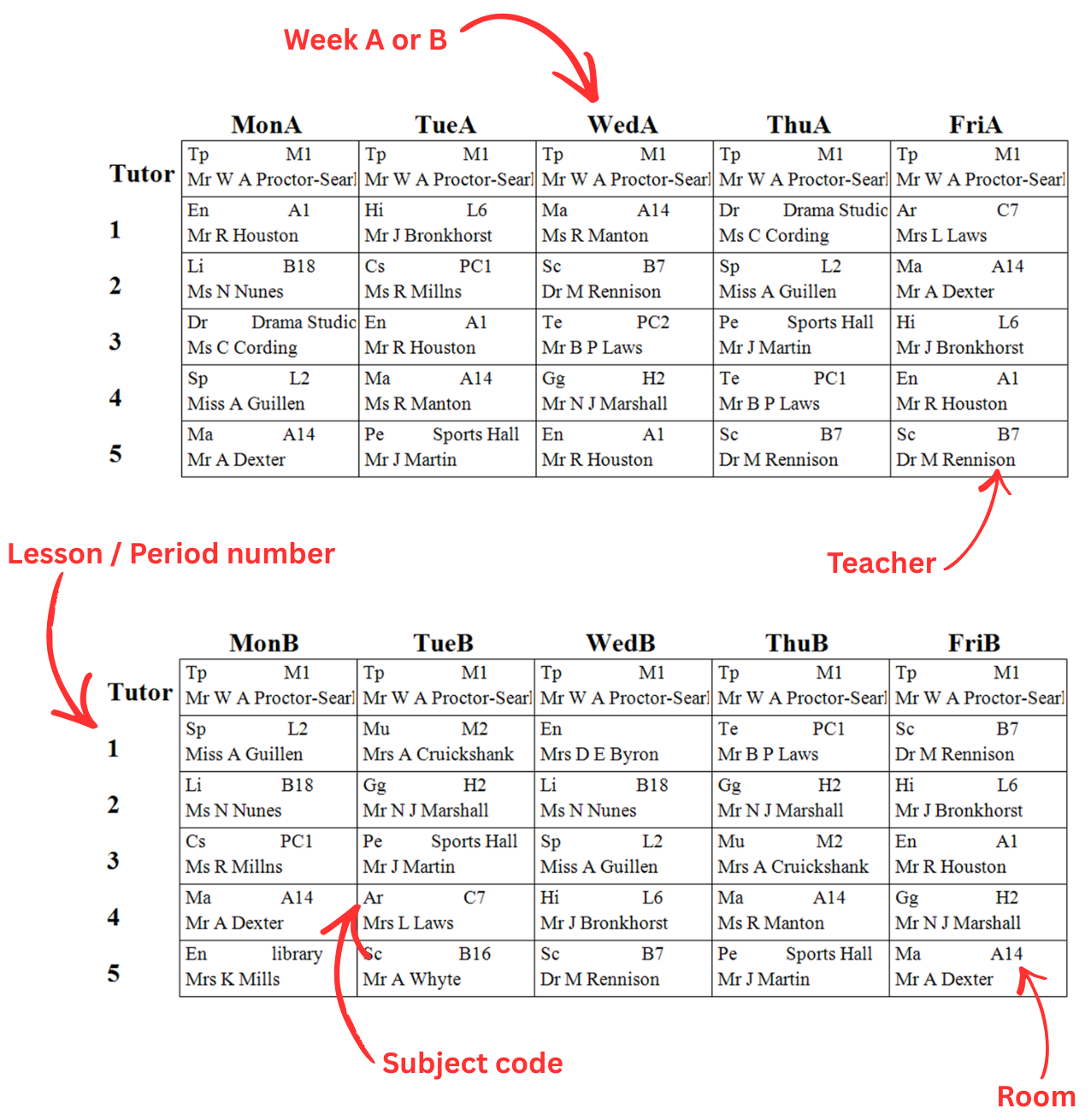 Instead of the same classes every single Monday, our school follows a two-week pattern. We call these Week A and Week B. This system gives students more variety in their subjects and more time with their teachers over a two-week period.